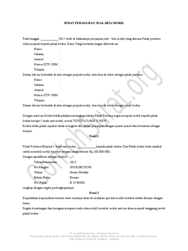 Surat perjanjian jual beli sangat diperlukan terutama ketika kamu membeli barang-barang yang memiliki nilai tinggi seperti. Pihak Pertama menjual 1 buah unit mobil Honda Brio kepada Pihak Kedua dan Pihak Kedua telah sepakat untuk membeli mobil tersebut dengan harga sebesar. Surat kebenaran bawa kenderaan 1.